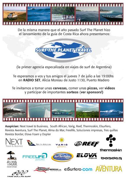 De la misma manera que el año pasado Surf The Planet hizo el lanzamiento de la guía de Costa Rica, ahora hace su presentación SURF THE PLANET TRAVEL: la primer agencia especalizada en viajes de surf de Argentina. FECHA: Jueves 7 de julio a las 19:00hs - LUGAR: RADIO SET (Alicia Moreau de Justo 1130 - Puerto Madero - Bs As) SORTEO de PREMIOS GENTILMENTE CEDIDOS POR LOS SPONSORS: remeras y buzos Tres quillas, remeras buzos y zapatillas REEF, neoprene Thermoskin, 1 tabla de surf custom-made de DOPPLER SURFBOARDS, 1 pasaje a SUD AFRICA, 1 pasaje a Florianopolis, kits de parafinas y gorros de lana FREE LIFE, juegos de quillas BULLET y otros- Les dejamos algunas fotos de la noche y de las entregas de premios: