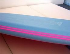 Foto: el interior de las tablas GARZA Softboards: shape terminado con sus dos almas, listas para ser recubiertas con las laminas de Espuma de PoliEtileno Reticulado para su terminacion. Las quillas son de goma y por lo tanto no te podes cortar con ellas, son practicamente inofensivas en comparacion a las quillas de fibra de carbono de las tablas de surf regulares. Ademas de las almas, se pegan cuatro hileras de bordes de cada lado, de espuma de PE (poli-etileno) de alta densidad que le dan aun mayor dureza y resistencia, trabajando como almas externas. Las tablas pueden ser reparadas con siliconas o poxipol en caso de producirse agujeros o roturas, es dificil que se quiebren pero no imposible, dependiendo del uso al que se exponga. Sus colores se mantienen con el transcurso del tiempo a diferencia de las tablas de fibra que se van poniendo amarillas con el efecto de los rayos ultraviolestas. Algunos detalles constructivos y de terminación: