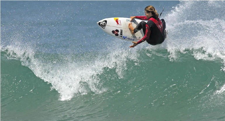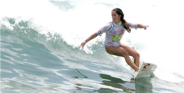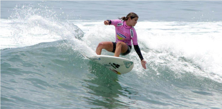 Surfer Girls: el lado femenino del deporte. txt: 3 quillas fotos: colaboracion de lectores y créditos según el caso Cada vez son más las chicas que se estan acercando al surf. Compartan la experiencia junto a sus amigas, familia, sus amigos y sus novios... Es hora de mirar el surf desde adentro del agua! Y sí, amigos, ellas pueden volar, doblar con fuerza tirando agua para todos lados, y surfear mejor que nosotros los varones! Invitamos a todas las mujeres que se divierten en las olas a enviarnos via e-mail sus fotos en el agua, para ser publicadas aqui mismo. Foto (Crédito: Grupo Firbas) de la tablista peruana Alexia Jerí de quince años de edad, que hoy 1/2/2009 alcanzó la semifinal del Mundial WQS presentado por RipCurl y que se llevó a cabo en San Bartolo. Alexia con este resultado, culminó en un meritorio tercer lugar, por detrás de Analí Gómez (2da) y Sofía Mulanovich (1ra). La próxima fecha en la que tomará parte Alexia será la segunda del Tour Latino, a realizarse en dos semanas en Montañita, Ecuador.