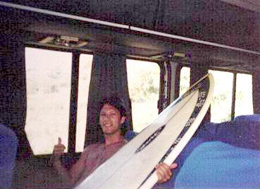 Foto arriba: Maximo y su tabla Spyder ''Wendy'', reviviendo la historia que ganó como mejor carta del mes en la Surfer Magazine en Noviembre de 1998. Enero de 2003: viajando de Praia do Rosa hacia Praia da Ferrugem (foto por Angelina). Abajo las pruebas que inspiraron la ironica historia: las tablas pagan más que el pasajero!!!