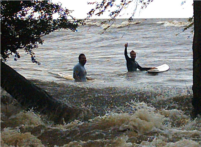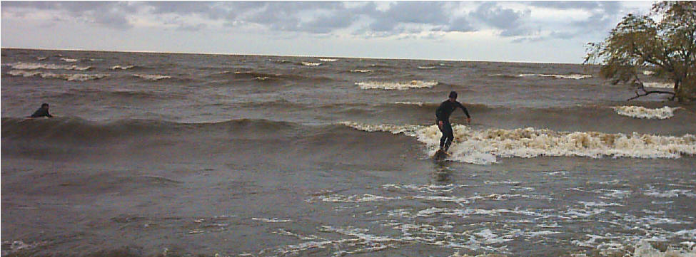 Sábado de Surf en Buenos Aires txt: Oscar Pedro Larghi Pix: Oscar Pedro Larghi oscarlarghi@hotmail.com Los surfistas del mundo siempre rezan por algún viento. En California piden por los “Santa Ana” winds, en Hawaii por los “Tradewinds”, y nosotros en Argentina oramos por el “Pampero”. Después de algún tiempo de surfear aprendes la rutina de un par de días de viento del sur y un swell que se acerca. Luego de haber vivido unos años en Mar del Plata (hace siglos, en la época pre-Internet!), cuando volví a Buenos Aires, sabía que luego de un Pampero tenía que cargar las tablas en el auto y partir para Mardel. Sabía que si seguía soplando del Sur, podría correr Waikiki, el Yacht, el Torreón o la Popu, y si el viento rotaba por tierra y se clavaba Noroeste, las sesiones clásicas en el Sur serían una fija: Ganancia total! Hace 10 años que volví de Hawaii y me instalé de vuelta en Buenos Aires, sabia que tendría que amigarme con el río para mantenerme medianamente vivo. Empecé haciéndome unos paddleboards con los que me mantenía en estado para no perder remada cuando iba a la costa, además con ellos agarras las ondulaciones del río o las olas de los barcos. Finalmente con mi Tandem empecé a investigar la “north shore” de la costa del Río de La Plata, en busca de las olas de las que había oído hablar desde principios de la década del ochenta cuando empecé a surfear. El mito urbano existe entre los surfistas porteños y el ex campeón argentino de surf Marcelo Ray, me lo confirmó un día cuando me contó que a principios de los setenta se tiraban a surfear frente a la Facultad de Arquitectura de la Universidad de Buenos Aires, en Ciudad Universitaria. Y la verdad que con sólo acercarte al río un día de viento Sur, o aún más con una Sudestada, se puede confirmar que al igual que en el mar, aquí también se forman olas, también es verdad que para agarralas necesitás el vehículo apropiado. Hace 4 años que patrullamos el río remando las canoas hawaianas y he ido descubriendo innumerables points que he disfrutado, como muchos otros, en soledad. El fin de semana pasado cuando, ahora sí con la ayuda de Internet, chequeé los mapas en “El Surfero” y vi que anunciaban 30 nudos de viento Sur. Sabía que iba a ser uno de "esos" días. Me apuré a terminar una SUP Board que estaba haciendo para un amigo y lo llamé diciéndole: ”Preparate este sábado, vas a bautizar la tabla, y es muy probable que con olas, así que rezá!” Mi amigo Hernán, uno de esos típicos surfistas porteños, padre de familia que trabaja de lunes a viernes y sueña con esos 15 días de surf en el verano, hace un tiempo que venía entrenándose con el paddleboard, pero aún no había visto el río con olas, por lo que mantenía un sano escepticismo... Y el día llegó, luego de una semana de calor intenso, el viernes el viento dio vuelta “Pampero”. Y aunque no llegó tan fuerte como lo previsto, fue lo suficiente como para dejar una olita de 1 pie, y unos 100 metros de recorrido.