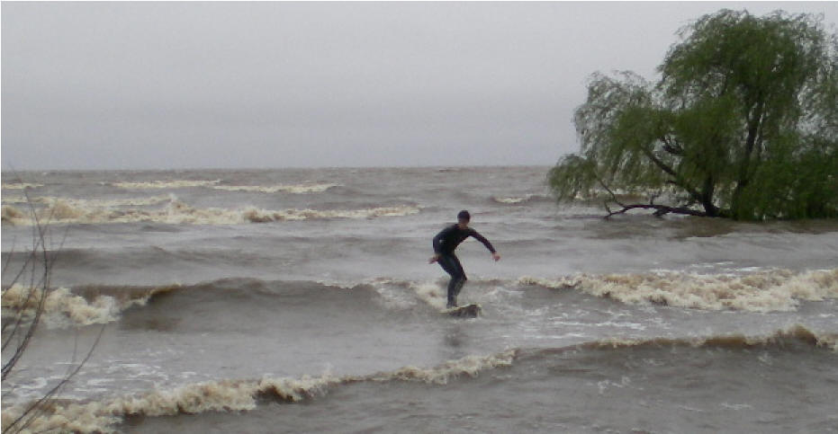 Se puede apreciar el efecto ondulador y acumulador de agua del viento Sud Este en las orillas occidentales del Rio de La Plata (Buenos Aires) mirando el nivel del agua en el árbol semi-sumergido de la derecha. Asi como el Pampero lleva por el contrario el agua y las olas hacia las costas orientales del Uruguay. La subida del nivel del agua y la ondulacion local generada por las fuertes ráfagas sostenidas de viento sud-este permite que imagenes como la de arriba se hagan realidad. A tener en cuenta: peligro del fondo oculto del Río traicionero con maderas, vidrios, piedras, escombros, ramas, alhambres y demás "regalitos" dejados por el Hombre. Protecciones como botitas son fundamentales, más allá del abrigo contra el frío. Otro efecto del Sud Este es el de acumular la basura que flota sobre el Río, en sus orillas.