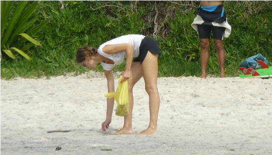 Arriba: el ejemplo a seguir y la actitud que queremos promover. Esperemos que sirva para que los que miran sin ver abran los ojos. Angie en Praia do Rosa, Brasil. Contenido de la bolsa: 5 pajitas de plástico, 17 colillas de cigarrillo, 2 latas de cerveza, 1 botella chica de agua mineral, 6 servilletas de papel, 1 toallita femenina Care Free usada (que ascooooo!!!!!!!!!!!!) y 5 tapitas de plastico.