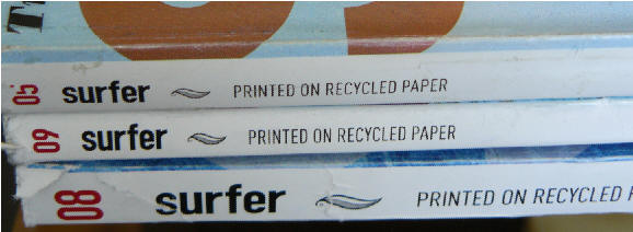• Revistas como la mitica SURFER MAGAZINE estan editando sus numeros enteramente sobre papel reciclado, ahorrandole al planeta grandes cantidades de energia electrica, combustibles fósiles y de fibras de celulosa virgen, es decir, arboles (nada que ver, pero alguien se acuerda del "Hombre Arbol" que salio en INFOBAE una vez???). Abajo: lomos de revistas Surfer Mag "printed on recycled paper". Bien!