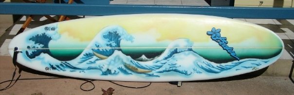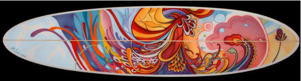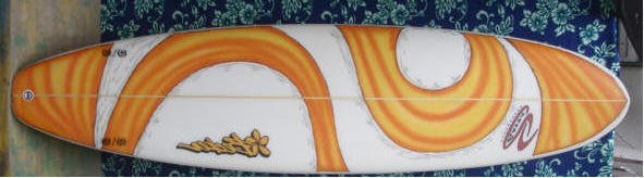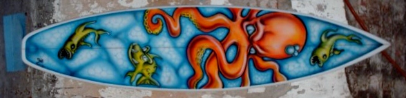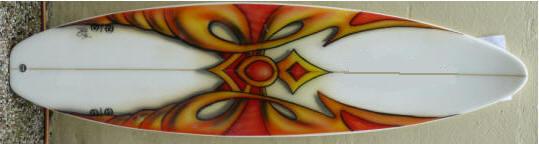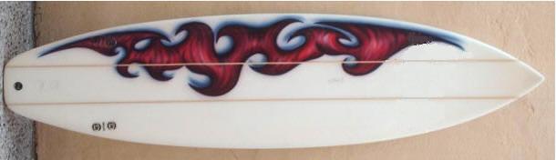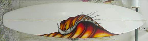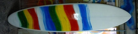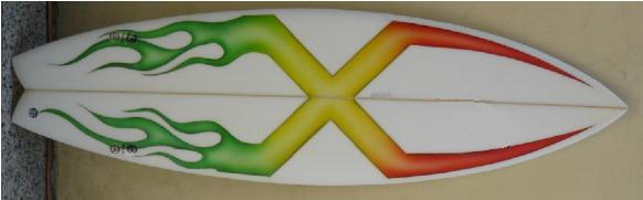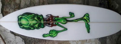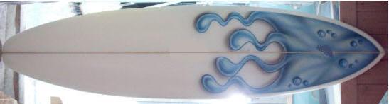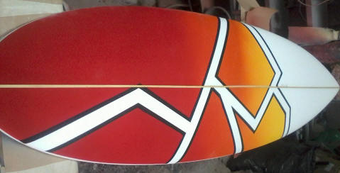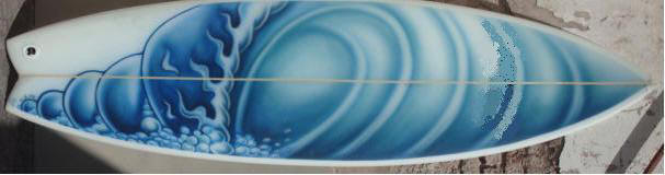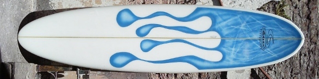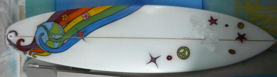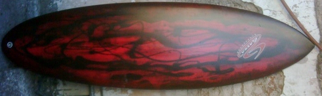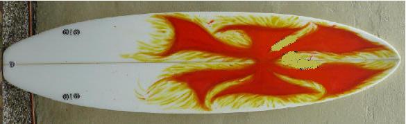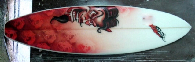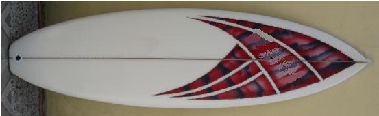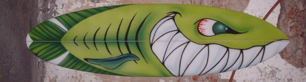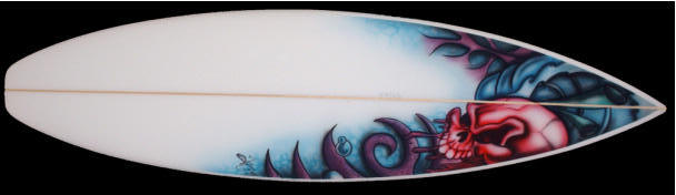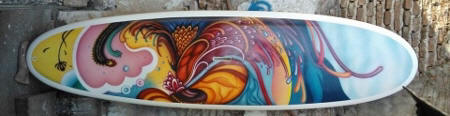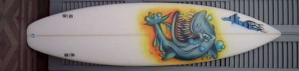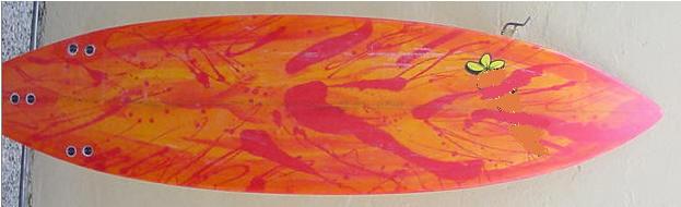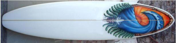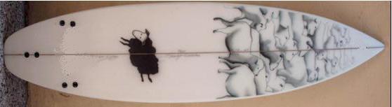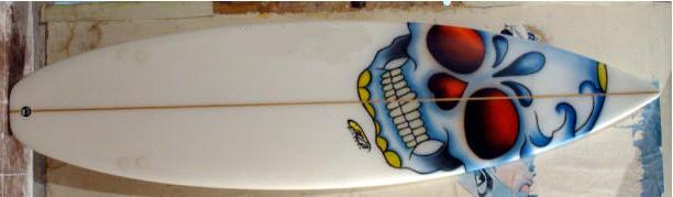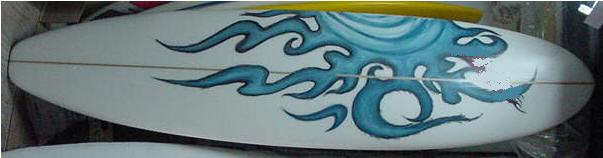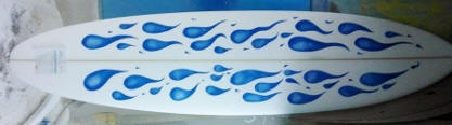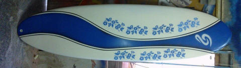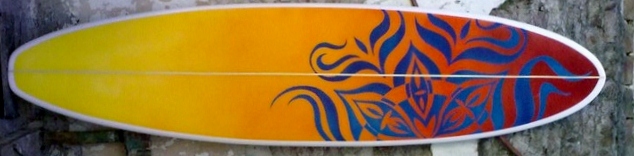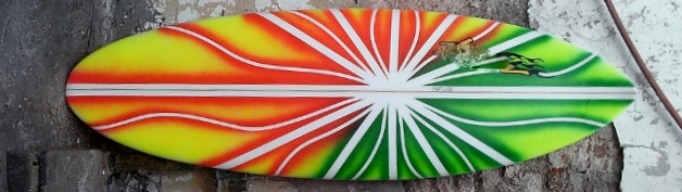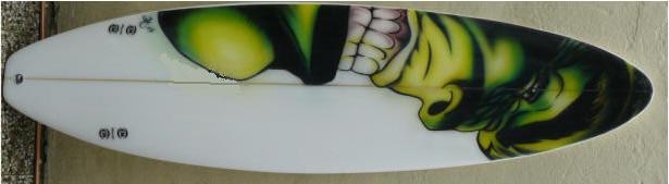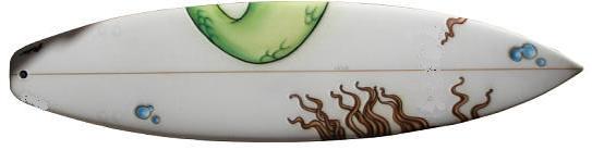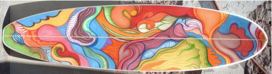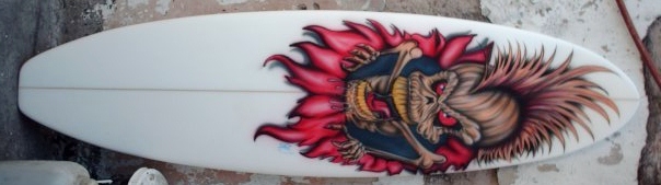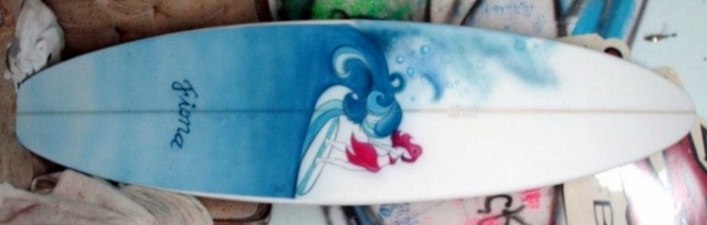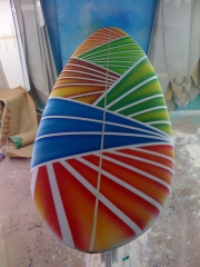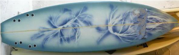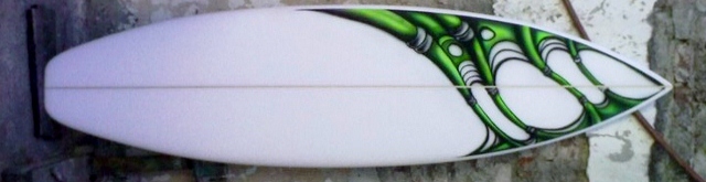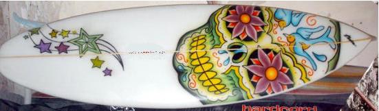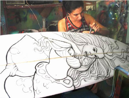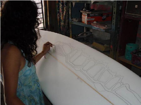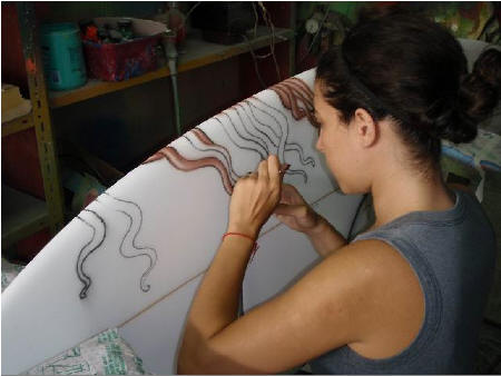 Una vez terminado el shape de la tabla, se procede a pintarla según los colores y diseños elegidos en nuestro catalogo o traídos por ustedes. Se trabaja con aerógrafo, pinceles y marcadores. Luego se pasa a la laminación con fibra de vidrio y resina poliéster. Abajo, Vero Segura dando forma a una de sus creaciones 2009: un verdadero arte!