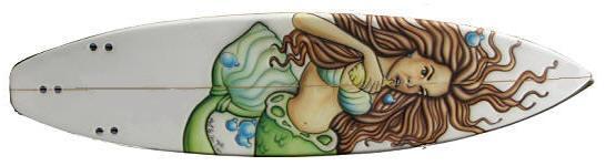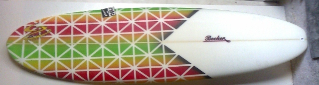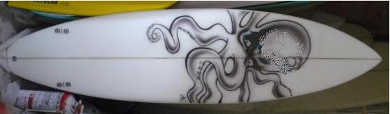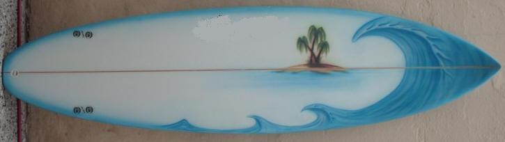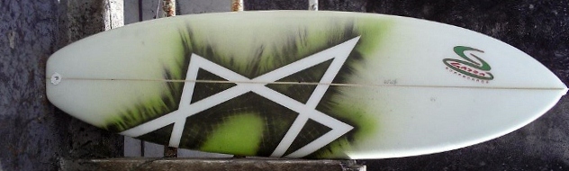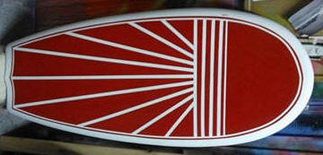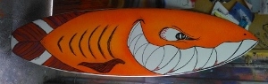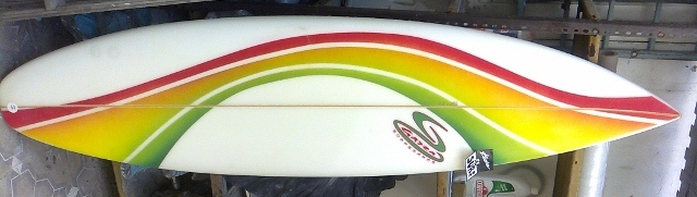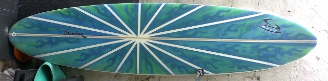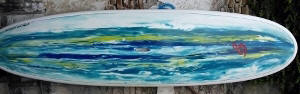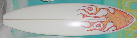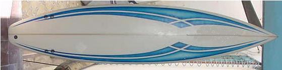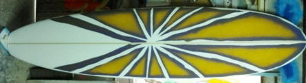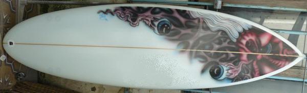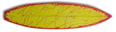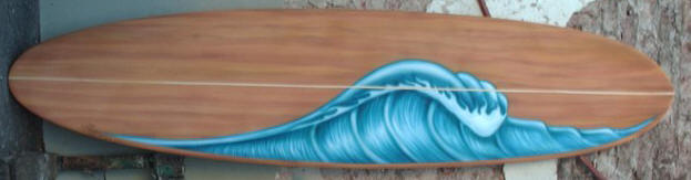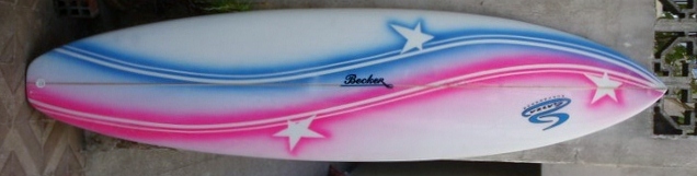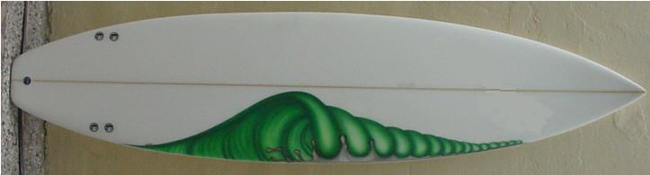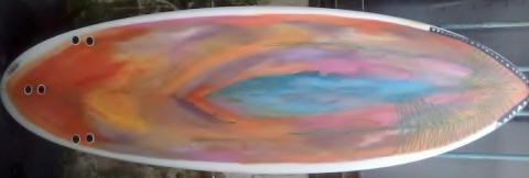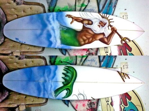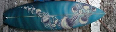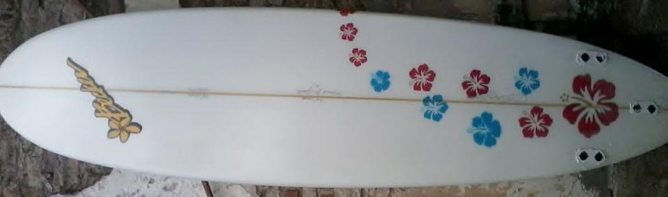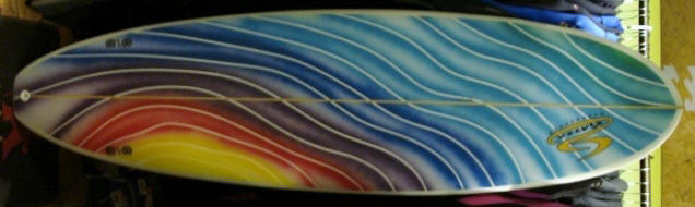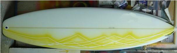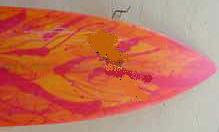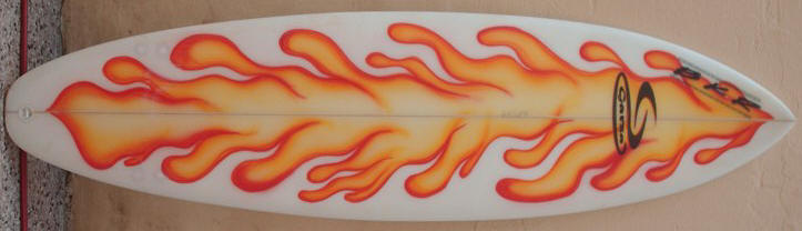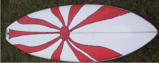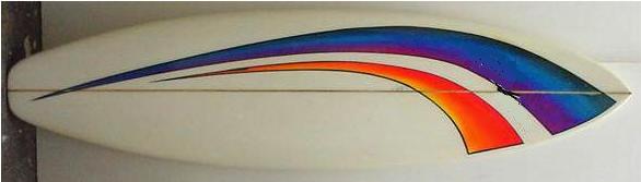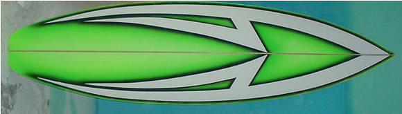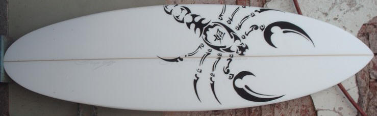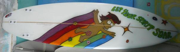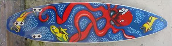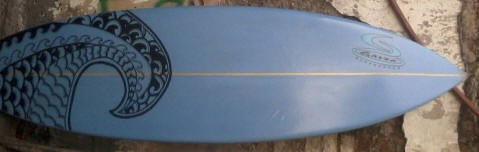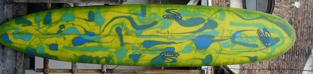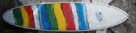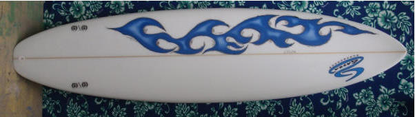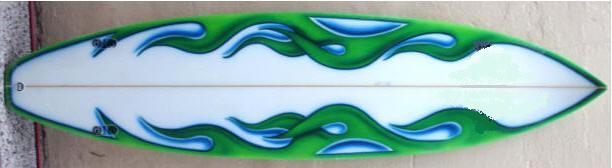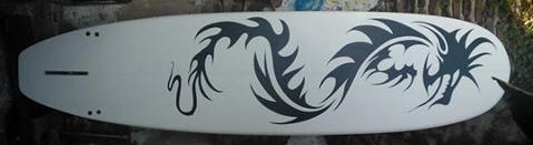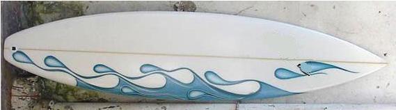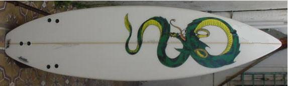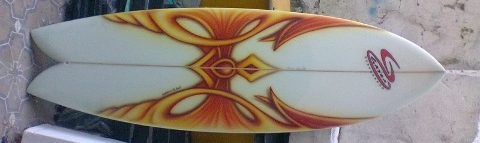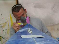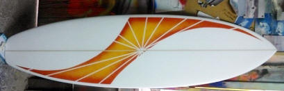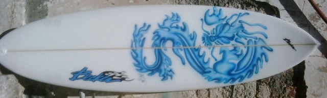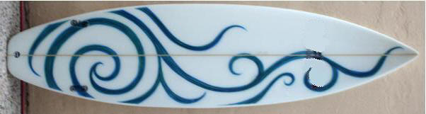 Una vez terminado el shape de la tabla, se procede a pintarla según los colores y diseños elegidos en nuestro catalogo o traídos por ustedes. Se trabaja con aerógrafo, pinceles y marcadores. Luego se pasa a la laminación con fibra de vidrio y resina poliéster. Abajo, Vero Segura dando forma a una de sus creaciones 2009: un verdadero arte!