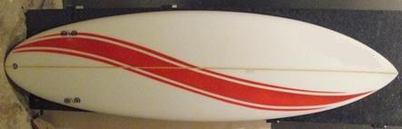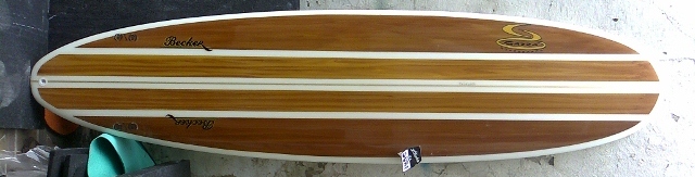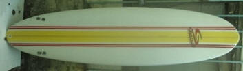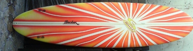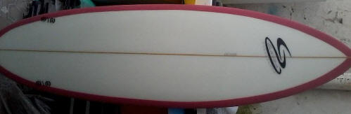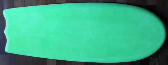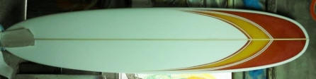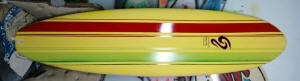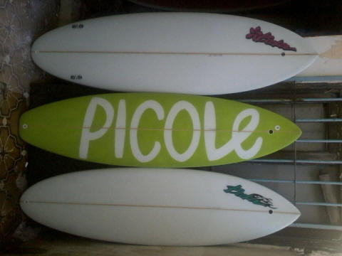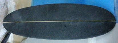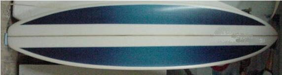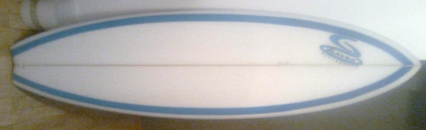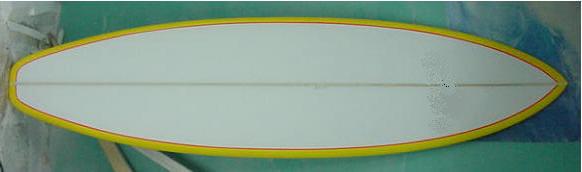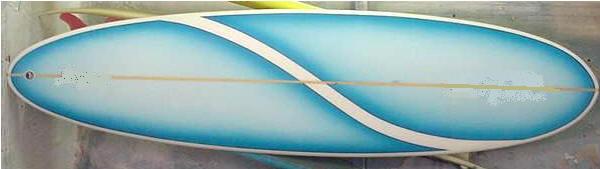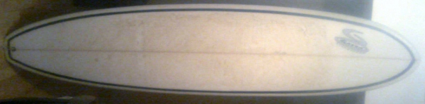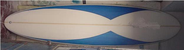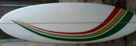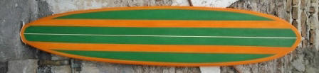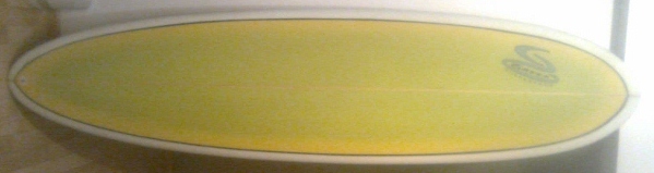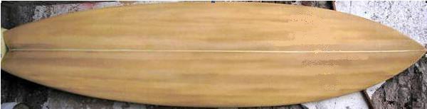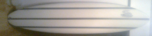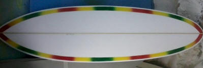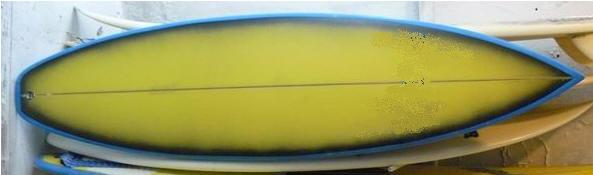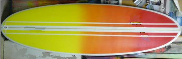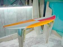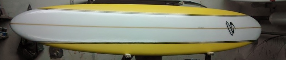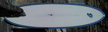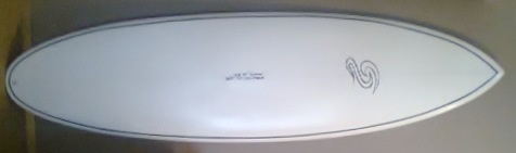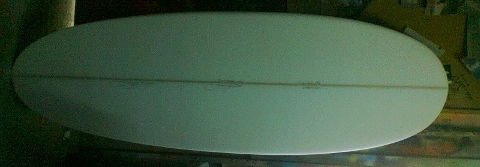 Vista de adelante de un Mini Malibu 8 pies recién laminado. Podemos ver el Rocker de nariz: está levantada con respecto al eje horizontal. Y en esta otra tabla se puede apreciar un rocker mas pronunciado, de una tabla tipo Shortboard.
