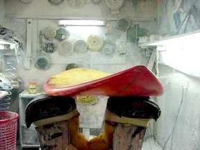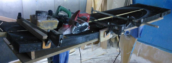Garza dando forma a los bordes de una tabla nueva. 11 de Octubre 2003 / Pueden ver el cambio progresivo en la forma de los bordes, desde redondeado a la derecha a filoso al acercarse a la zona de las quillas.