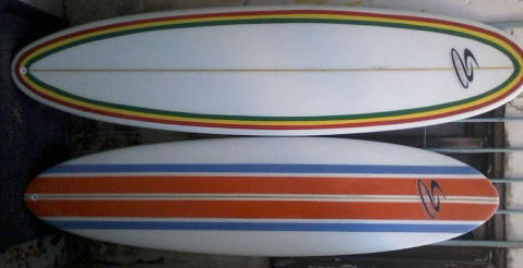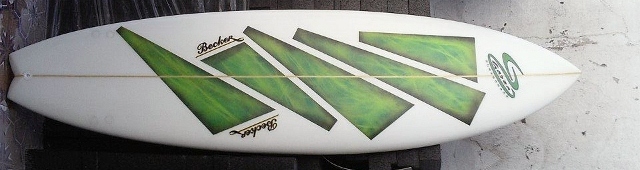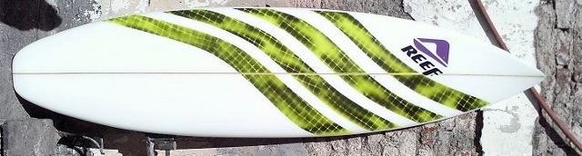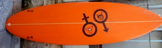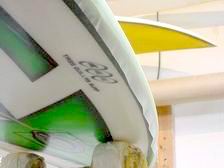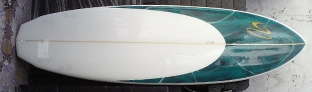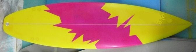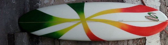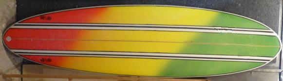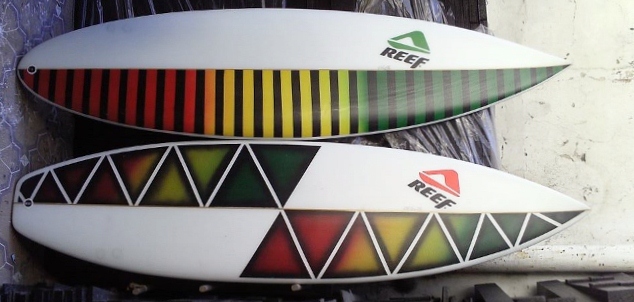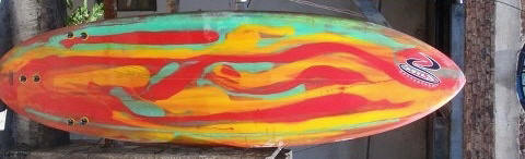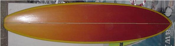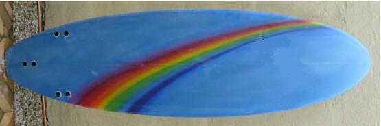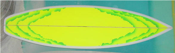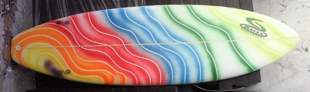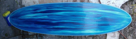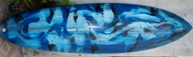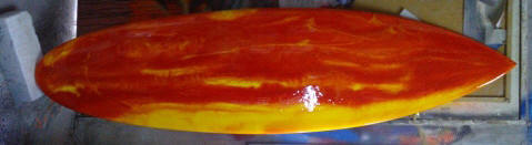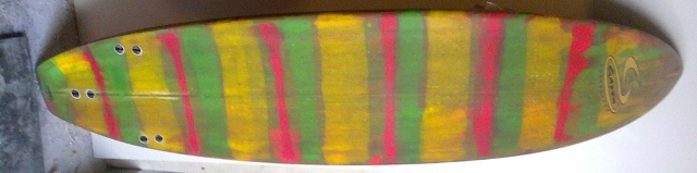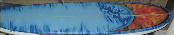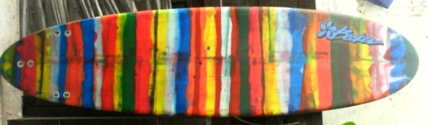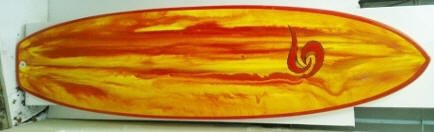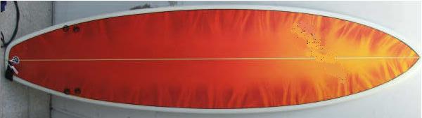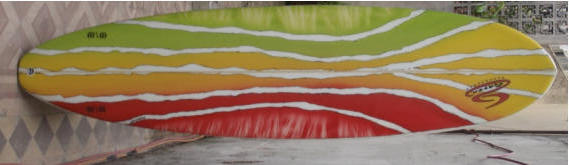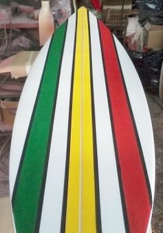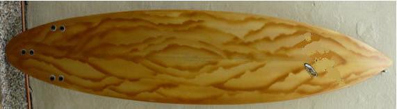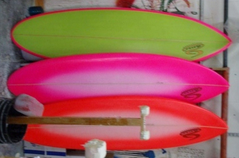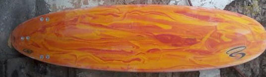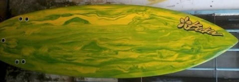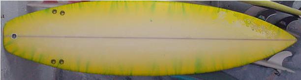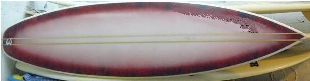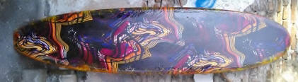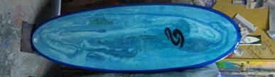 2) resina pigmentada: Existe también la opción de mezclar pigmentos de colores con la resina poliéster a la hora de laminar una tabla. El resultado de dicha mezcla es una resina coloreada en lugar de transparente como lo es usualmente. En estos casos no se verá el alma de la tabla. Se pueden lograr efectos interesantes mezclando pigmentos, logrando efectos como pueden ver en las fotos abajo.