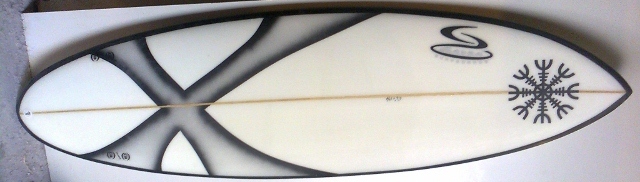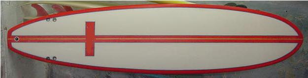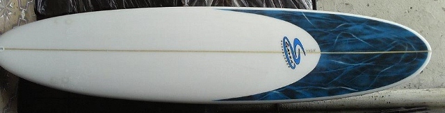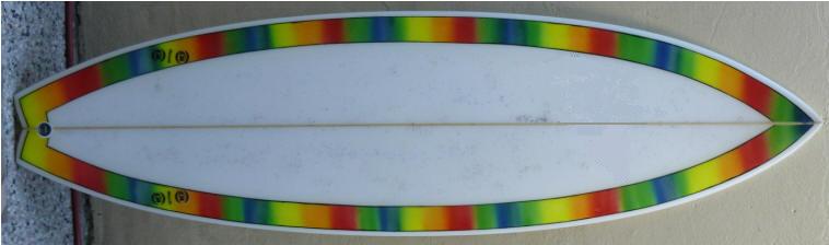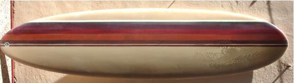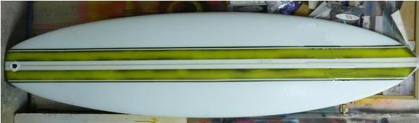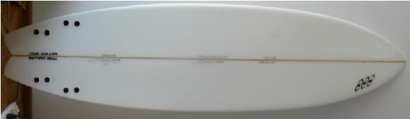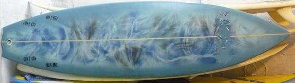 - Números sobre el stringer (o alma): Los shapers escriben algunas de estas medidas y otros datos útiles en cada tabla que producen, además de incluir su firma. En las fotos (abajo) se puede leer el numero de serie de la tabla (4846) y la fecha de shapeo (10-2008). Así también como las medidas principales: longitud (7'0'') y espesor (2'' 1/2), y abajo el ancho a la altura de la mitad de la longitud de la tabla (21''), el ancho de nariz medido a un pie de la punta (13'' 3/4) y el ancho de la cola medido también a un pie de distancia esta vez de la cola de la tabla (15'' 1/2). Se suele dedicar la tabla al surfista que la encargó (Special for ...). Algunos shapers incluyen información mas detallada y técnica como por ejemplo: 7'6" RUL 10.85-18.5-14 1.15-2.35-1.55-2.35 que pueden ser útiles a la hora de querer vender tu tabla o de querer hacerte una igual. En este caso la información es muy completa y significa:RUL: foam Resistente Ultra Light (lo ultimo en foams) ; ancho de nariz, ancho, ancho de cola, rocker delantero, rocker trasero, espesor (siempre expresadas en pulgadas). Se suele indicar tambien la posición de las quillas con la distancia a los rails.