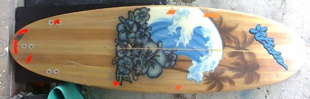 4- Si tu tabla sufre alguna avería, por mas chica que sea, hacela arreglar lo antes posible. Paradójicamente las tablas de surf no son "water resistant" y si les entra agua las consecuencias serán muy malas: el foam se tiñe de marrón; si la tabla es dejada al sol, esta misma agua alojada en su interior se evapora creando burbujas de aire y deslaminando la tabla en casos extremos. Además la acumulación de agua hace mas pesada a la tabla. IMPORTANTE: asegúrense de drenar primero el agua que pueda contener la tabla antes de repararla y sellar la ''herida''. Los parches con Silver-Tape deben ser provisorios. Reparar cuanto antes con resina y materiales.