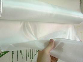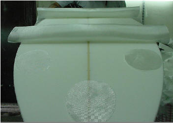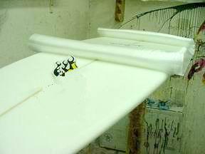 Paño de tela de fibra de vidrio en su rollo y sobre la tabla shapeada, sobre el cual se vierte la resina poliéster para comenzar el proceso de laminación.