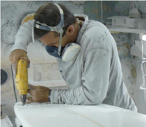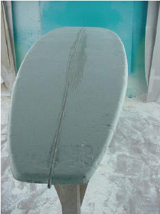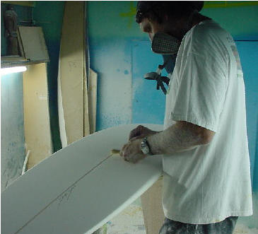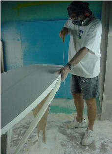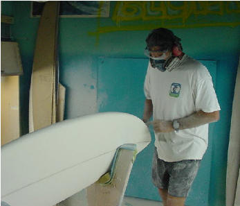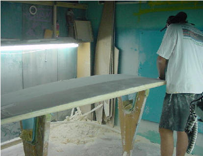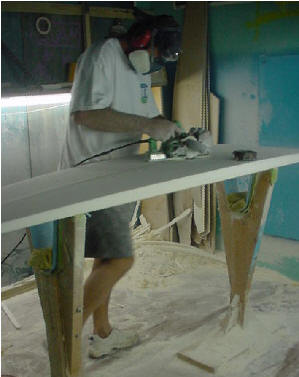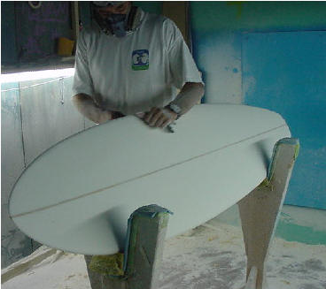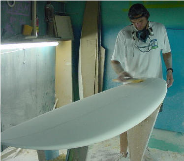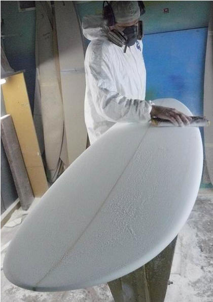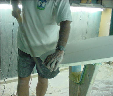 Una vez laminada la tabla, se debe recuperar en la mayor medida de lo posible las formas originales del shape original. Ahora el shape esta recubierto por una "cáscara" de resina poliéster combinada con fibra de vidrio que le da la ansiada resistencia.