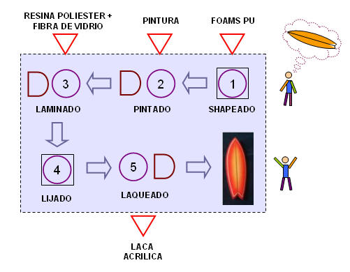 Diagrama de Procesos (simbología internacional Therblig): Pasos básicos en la Fabricación de una tabla de Surf.