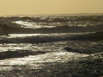 Fotos arriba: (izq) un día de olas realmente grandes en La Paloma (2 metros pasaditos) - (der.) Más arriba les mostramos el mar de "oro", ahora el mar parece ser de "plata"... la verdadera riqueza está en la Naturaleza - Enero 2005. Por Angie.